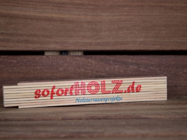 Meterstab mit 2 m Länge und praktischer 45°-Rastung. Ideal für exakte Messungen bei der Terrassen- und Holzmontage. Mit sofortHOLZ.de-Logo.