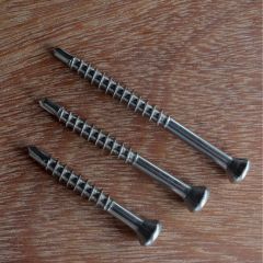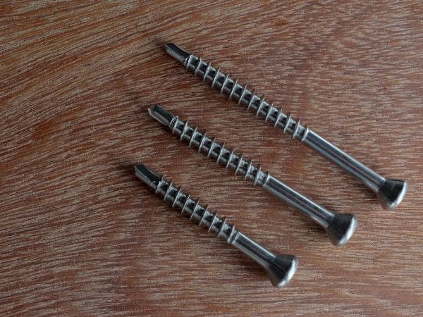 Spezialschraube aus Edelstahl mit Bohrspitze zur sichtbaren Befestigung von Terrassendielen auf Aluminium-Unterkonstruktionen. Bietet sicheren Halt und eine saubere, langlebige Verbindung.